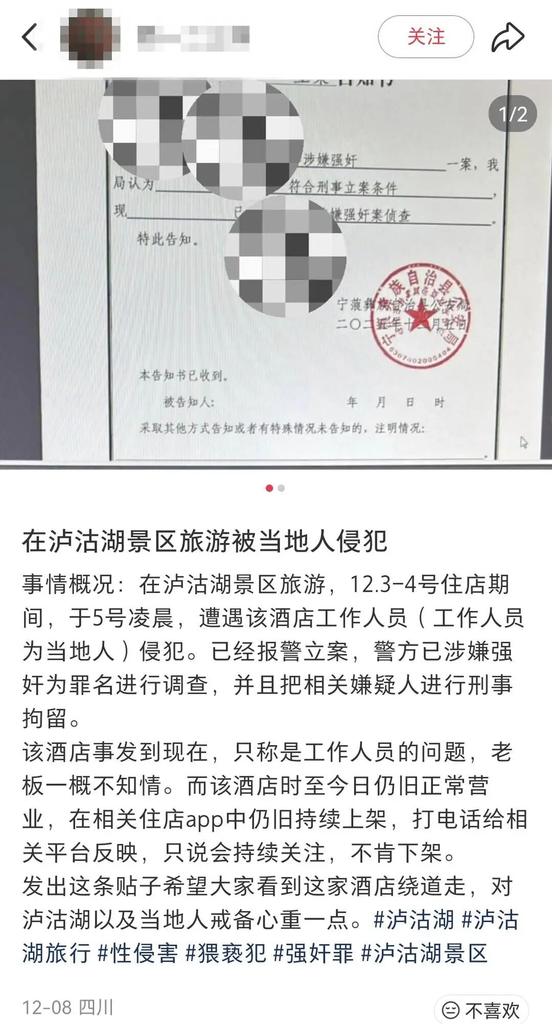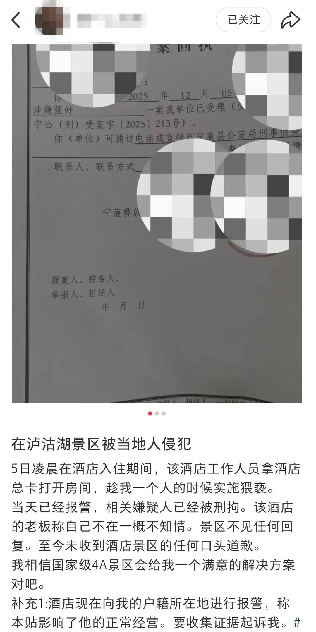 该游客称,自己12月3日、4日住在泸沽湖山屿海湖景度假酒店(花海码头店)。5日凌晨,酒店工作人员拿酒店总卡刷开她的房间,对她实施侵犯。她在评论区表示,自己当晚“有点喝多了”,该酒店工作人员实为酒店前台。