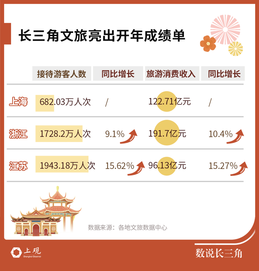 上海、浙江、江苏三地的旅游收入,合计达410.54亿元,接近全国数据的一半,在目前已公布的各省市中,占据前六位中的三席。浙江收入位居榜首,上海游客人均消费最高,为2026年赢来“开门红”。